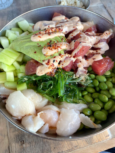 埠頭で食べたハワイ料理のPoke 左下の白いのが帆立て貝と思って喜んでいたら ライチだったのでびっくりがっかりでした 驚いた孫のヒトデ 娘は二人···